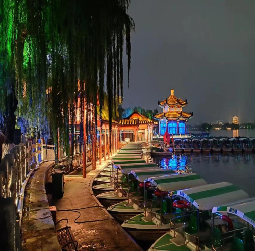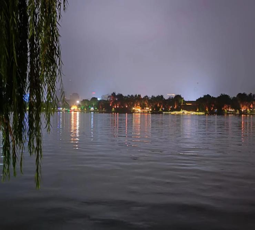 晚上閑暇時(shí)刻突發(fā)意念,便想起去大明湖夜游。大明湖湖面寬廣,湖中有幾個(gè)小島,但景觀大部分在四周的沿岸。盡管坐船覽湖,有披波激浪的愜意,有閑風(fēng)拂面的輕松,但卻是走馬觀花。“紙上得來終覺淺,絕知此事要躬行”,要細(xì)細(xì)地、慢慢地品賞大明湖,巧遇是一種浪漫,大明湖是適合浪漫的。雖然它不具鼓浪嶼醉的人海風(fēng),更沒有迷人的沙灘,不具杭州西湖那么遼闊和名氣,但我覺得它是北方城市中最浪漫的湖。游大明湖,無論年齡多大,我想最好給自己一個(gè)愜意的理由,懷一顆浪漫的心。讓那堤岸搖蕩的垂柳,輕拂額頭,撩撥久居市井而混沌的心胸,撣禪生活中積沉的塵燥。如果你意誠,柳拂是能禪心的。心明了,眼亮了,滿目就會(huì)是紅情綠意。整體來說大明湖景點(diǎn)的燈光很美,