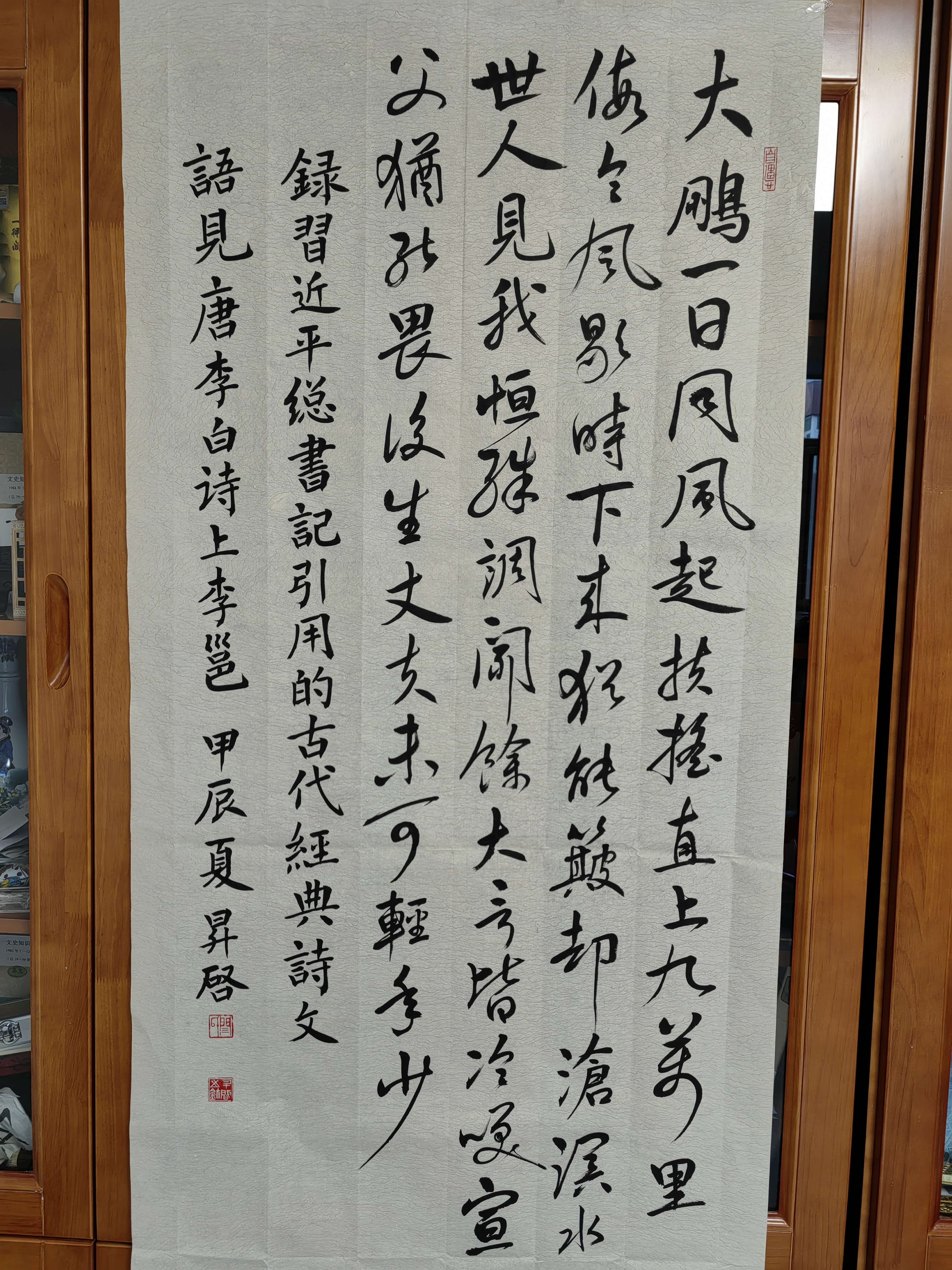 行書書法作品《上李邕》釋文:“大鵬一日同風(fēng)起,扶搖直上九萬里。假令風(fēng)歇時下來,猶能簸卻滄溟水。世人見我恒殊調(diào),聞余大言皆冷笑。宣父猶能畏后生,丈夫未可輕年少?!?,