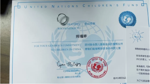對于參與聯(lián)合國兒童基金會計劃項目捐款這件事,師瑾祥并沒有刻意宣揚,作為項目技術(shù)員,他每個月寫新聞報道公司都有稿費,拿到稿費的師瑾祥并沒有想著如何去消費,而是想到了曾經(jīng)在瀏覽網(wǎng)站時,看到過聯(lián)合國兒童基金會官方舉行的月捐項目,他毫不猶豫地將這筆稿費捐贈給了聯(lián)合國中國偏遠(yuǎn)地區(qū)困境兒童。從那時開始,他就與聯(lián)合國兒童基金會捐款項目結(jié)下了不解之緣。從2021年4月到現(xiàn)在,累計向該項目捐款6次1200元。一次次無心的善意,沒想到9月后收獲了饋贈,這封來自聯(lián)合國兒童基金會的感謝信、榮譽證書和榮譽戒指讓師瑾祥充滿了喜悅。這一枚用可回收材料制作的紀(jì)念戒指,既是對善心善舉的紀(jì)念,更是對其向善愛心的褒揚。貢獻(xiàn)雖小但長久,戒指很輕,也很重。