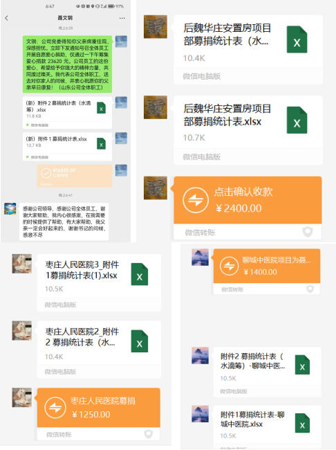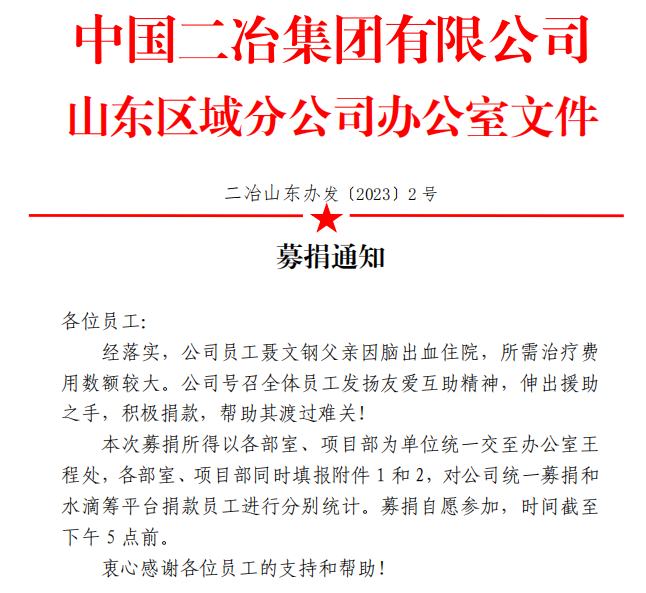4月21日,在山東分公司工作群中,隨著一份募捐通知的下發(fā),機關各部門、各項目部干部員工紛紛行動,為分公司曹縣安置房項目員工聶文鋼的父親進行愛心募捐。